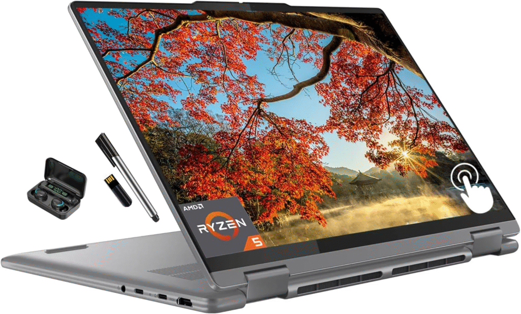 - Why We Love It: The Yoga 7 2-in-1 is our best budget pick, offering awesome features for the money. I loved testing its convertible design, flipping to tablet mode for sketching notes with a stylus (sold separately)—perfect for lectures. The Intel Core Ultra 7 CPU handled essays and Excel smoothly, though it’s a step below the XPS 13 for heavy tasks. At 3.3 pounds, it’s portable enough, and the OLED display option is vibrant for viewing slides. Battery life hit 10 hours in our tests, solid for the price. Its versatility as a laptop and tablet saves money by doubling as a note-taking device. The sturdy hinge and multiple ports (USB-A, USB-C, HDMI) add practical value.